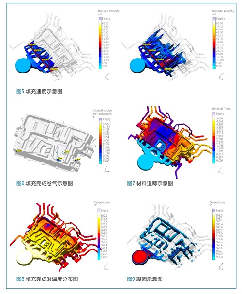 压铸生产过程中首先通过创建溢流道,对局部位置进行升温,从而改善AlSi10Mg(Fe)电控箱体铸件充型质量,同时模具内部创建水冷却系统可以在一定程度上降低模具的温度分布不均匀的情况,调节模具型腔内部铝液填充变化带来的局部温度过高,使模具达到均匀的热平衡效果。