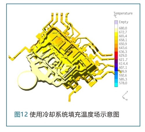 图12为完成冷却系统后的填充温度场结果,可知,随着填充的进行,由于水冷却系统的加入,有效的改善了铸件散热和凝固,结果表示,铸件温度均匀,温差小于20℃,明显改善电控箱体铸件填充过程温差大的缺陷。