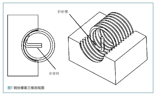 自由状态下钢丝螺套直径大于铝合金基体螺纹孔径,需要通过专用工具产生扭力把钢丝螺套旋入基体孔螺纹中。安装完毕,依靠钢丝螺套外螺纹张力与基体孔内螺纹之间产生摩擦力固定在基体螺纹孔内,最后由钢丝螺套内形成一个符合标准且性能优良的高精度内螺纹,以满足使用需求。钢丝螺套的三维投影剖视图如图1所示。
