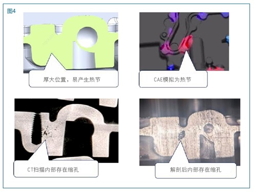 影响机理:分析确认水道盖板螺纹孔缺料位置为毛坯厚大位置,铝液充型后易形成热节,铝液最后凝固产生缩孔,通过CAE模拟分析、CT扫描、解剖均证明水道盖板螺纹孔位置易产生缩孔,造成水道盖板螺纹孔缺料。