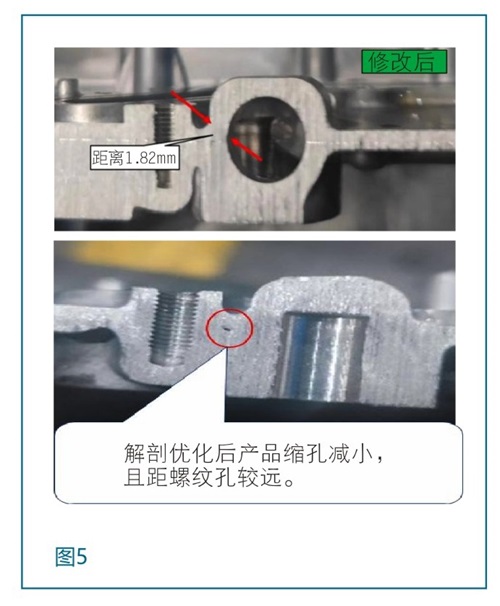 根据验证分析,结合高压铸造工艺特点,进水口与水道盖板螺纹孔位置减重槽越宽,热节风险可能越低。产品设计要求,电控壳体最小壁厚≥1.8mm才能保证使用过程中强度可靠。分析阶段对进水口与螺纹孔之间减重槽增宽后,机加成品壁厚实测为1.82mm,说明减重槽增宽后宽度已接近极限值,减重槽宽度经团队讨论最终按分析阶段验证结果,确定为3mm。(图5)