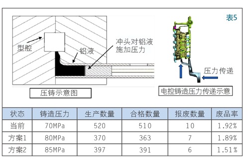 影响机理:铸造压力通过冲头施加在金属熔体上可以进行补缩,铸造压力越高表面补缩越好,对比验证结果,说明铸造压力对水道盖板螺纹孔缺料无显著影响,铸造压力是非真因。(表5)