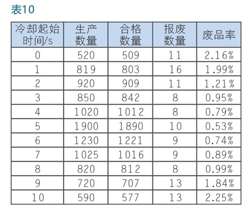 为确定最佳冷却起始时间,在工艺范围内(0s-10s)按照1s的梯度进行验证。对比验证结果,结合设备设置精度,冷却起始时间设定5s,效果验证:2024年6月5日冷却起始时间设置为5s,连续生产1900件,经加工验证共计10件,废品率0.53%,措施有效。(表10)