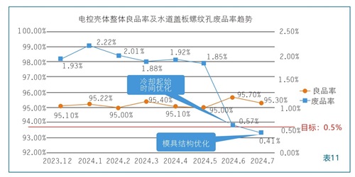 通过优化冷却起始时间,模具结构,水道盖板螺纹孔缺料由2.01%降低至0.41%,整体改善明显,达成项目设定目标,对整体良品率进行跟踪,未产生其它次生影响。(表11)