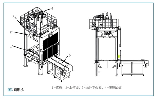 如图3所示,矫形机包括矫形柱架本体以及矫形模具,而柱架本体包含的上模板和底板可以通过油缸驱动上模板朝下合模;为满足超大型一体化产品的矫形,矫形机的压力能够达4000kN。整形模具包括可相互扣合的上模板和下模板,可以分别安装在上模板和底板上,在上模板和下模板上有根据产品仿形设计的支撑面,用以分别支撑在压铸件的背面和正面。将产品放入矫形机内,通过油缸驱动上模板朝下合模并保压,可以实现对产品矫形的效果。