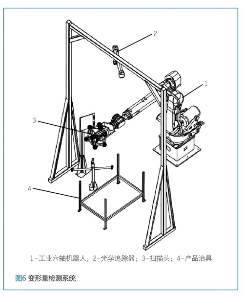 如图6所示,变形量检测方式采用的是蓝光扫描,工业六轴机器人搭载由星座球笼和三维检测传感器组成的扫描头,在一旁独立放置的光学追踪器能够实时跟踪定位机器人搭载的球笼系统。此设备的工作方式是通过搬运机器人把产品放置到检测治具上,检测机器人用扫描头扫描从不同方向多次扫描被检产品,得到检测出的点云,然后和产品3D模型进行拟合对比,检测出产品表面轮廓的变形量。