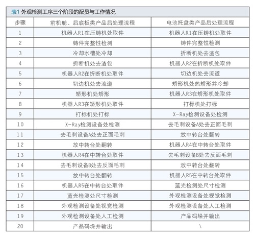 为了使压铸单元具备柔性化生产前机舱、后底板、电池托盘等主流产品的能力,并实现最大的空间利用率,提高设备综合效率、产品切换效率并缩短生产节拍,必须对以上所有后处理设备进行合理的布局,对后处理工艺路径进行合理的规划。前机舱、后底板、电池壳三种主流一体化铸件的后处理流程如表1所示。