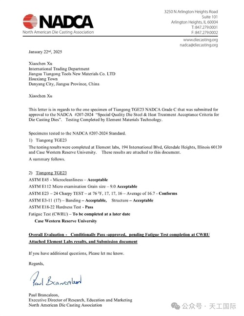 其实在2025年1月份,天工国际的模具钢已经取得北美压铸协会的认证资格证书,这是目前中国唯一的一家获此证书的企业。这代表着天工国际的大型压铸模块,技术质量已被北美高端市场认可。